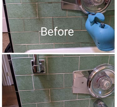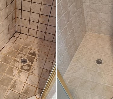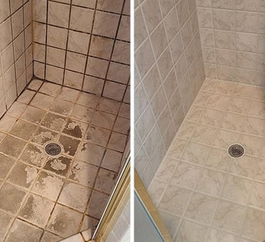 We use a local brand of cleaner Groutko Products and the best in the business. We have over 20 years experience cleaning grout. We apply our Groutko cleaner on the tile and grout surface, wait for a few minutes, scrub the grout and tile, and rinse with fresh water, making your grout and tile look like new again.